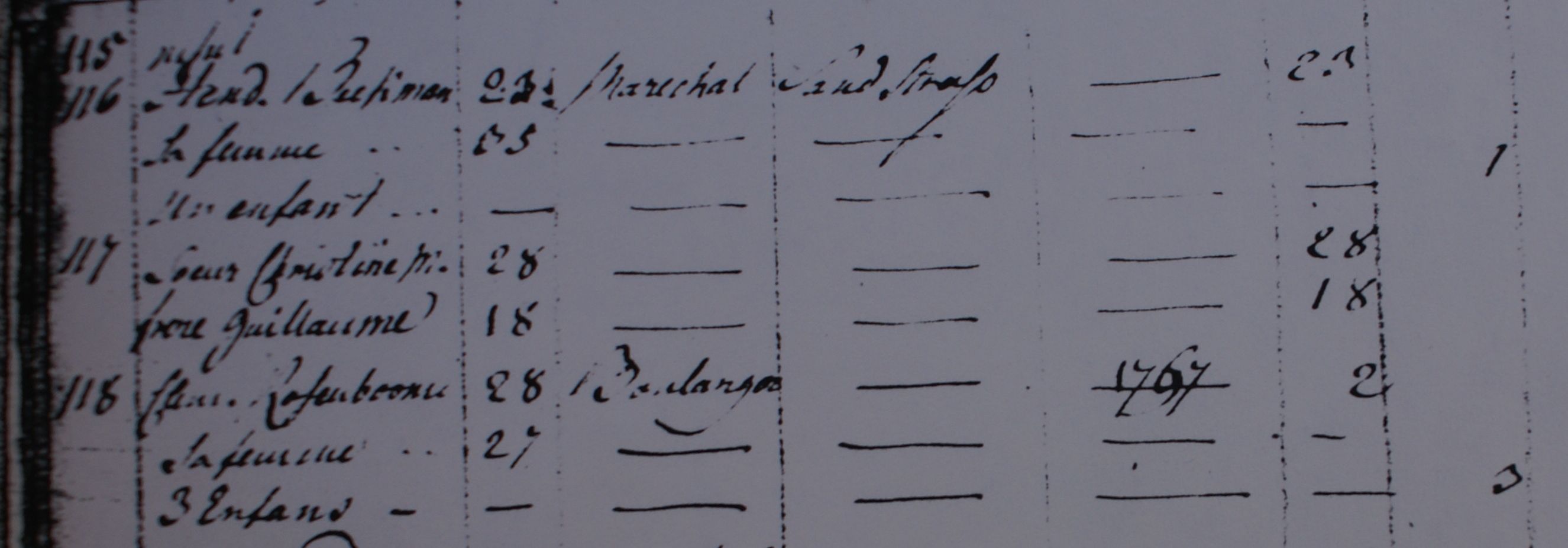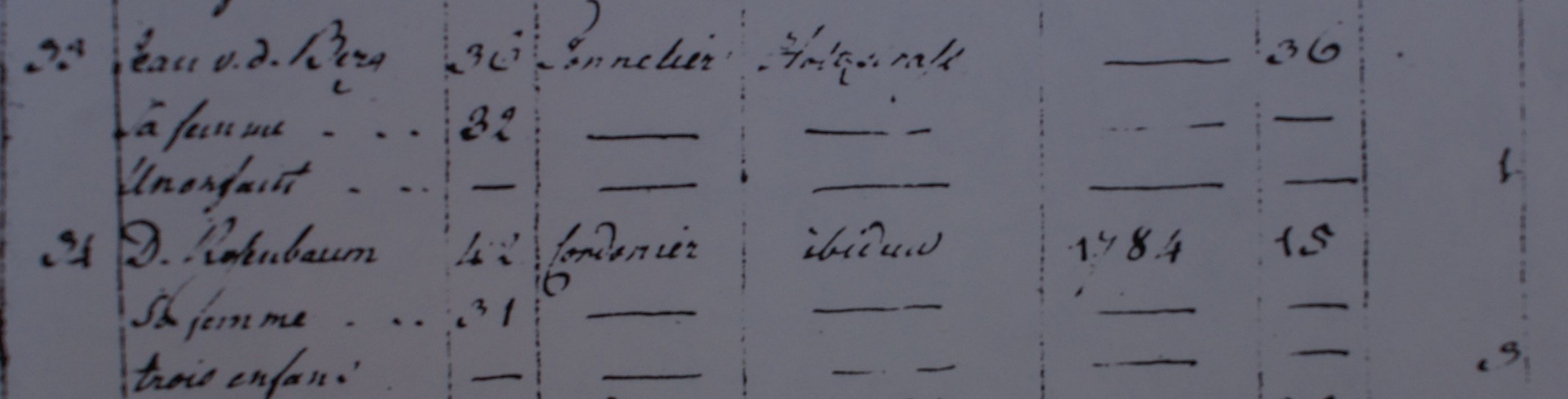 Eerst Theodorus: hij staat vermeld als D. Rosenbaum. D. van Dorus, zijn roepnaam. Leeftijd 42 jaar, wat aardig klopt met zijn geboortejaar 1758. Beroep cordonnier, schoenmaker. Deze roepnaam en beroep was ons al bekend uit andere akten van hem. Hij woont in de Holzstrasse, nu de Houtstraat, in huis nr. 34. Hij is in 1784 in Gennep komen wonen, in 1799 15 jaar geleden. Verder is vermeld op dit adres: sa femme, 31 jaar oud. Elisabeth Petronella Duijts is geboren in 1765. Dat is drie jaar verschil, maar dit is in deze lijsten niet ongebruikelijk. Bovendien is de lijst opgemaakt in jaar VII van de Franse Republiek en dat jaar loopt van 22 september 1798 tot 22 september 1799. Uit de lijst is niet op te maken wanneer ze in het VIIe jaar is opgemaakt, wel dat het in het jaar 1799 moet zijn geweest tussen januari en 22 september. Dat kan zo maar een jaar verschil maken. Ook uit de bewonerslijsten van Calcar, Altcalcar, Xanten blijkt dat de mensen in die tijd vaak hun geboortejaar niet weten of niet weten hoe oud ze precies zijn.